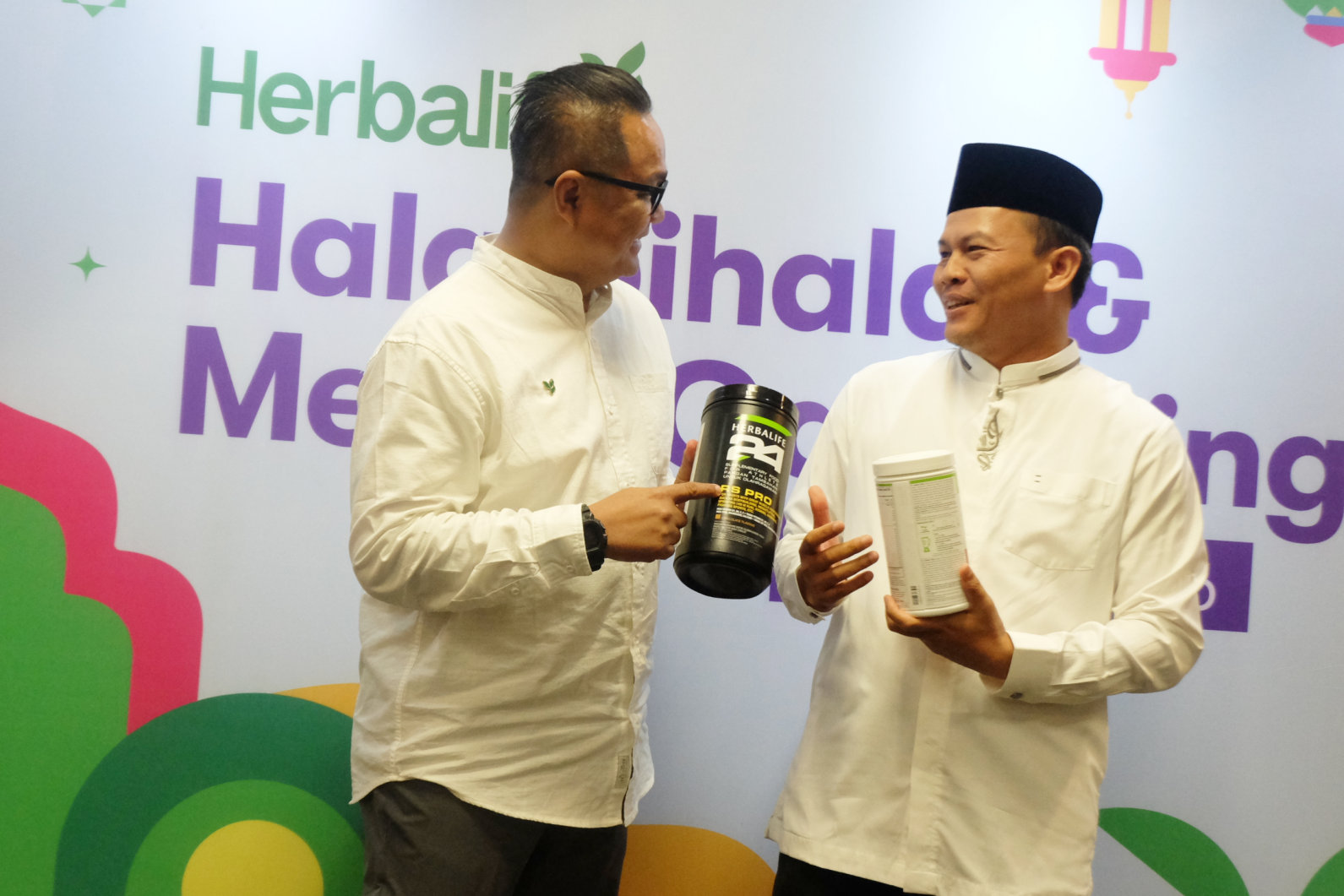 Direktur dan General Manager Herbalife Indonesia, Oktrianto Wahyu Jatmiko bersama Anggota Dewan Pengawas Syariah Herbalife Fauzan Sugiyono berfoto bersama usai acara Halalbihalal dan media gathering bersama...