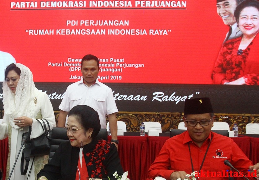 AKTUALITAS.ID – Ketua Umum DPP PDI Perjuangan Megawati Soekarnoputri (kedua kiri), Ketua DPP PDI Perjuangan Djarot Saiful Hidayat (kiri) dan Sekjen PDI Perjuangan Hasto Kristiyanto saat acara penyerahan kartu tanda anggota (KTA) PDI Perjuangan, di Kantor DPP PDI Perjuangan, Jakarta, Selasa (2/4/2019). Megawati Soekarnoputri menyerahkan kartu tanda anggota kepada para tokoh agama, purnawirawan TNI-Polri dan akademisi yang menyatakan bergabung bersama PDI Perjuangan. [Kiki Budi Hartawan].