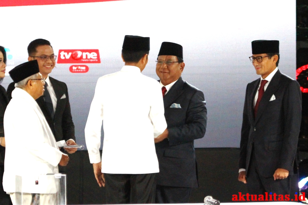 AKTUALITAS.ID – Pasangan capres-cawapres nomor urut 01 Joko Widodo (kedua kiri) dan Ma’ruf Amin (kiri) serta pasangan nomor urut 02 Prabowo Subianto (kedua kanan) dan Sandiaga Uno (kanan) bersiap mengikuti debat kelima Pilpres 2019 di Hotel Sultan, Jakarta, Sabtu (13/4/2019). Debat kelima tersebut mengangkat tema Ekonomi dan Kesejahteraan Sosial, Keuangan dan Investasi serta Perdagangan dan Industri. [Kiki Budi Hartawan].