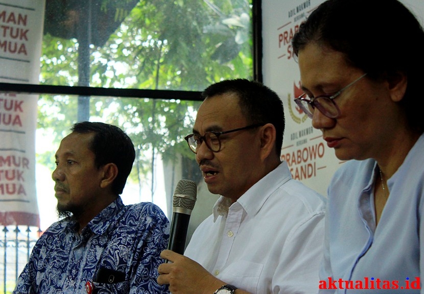 AKTUALITAS.ID – Wakil Direktur Media dan Komunikasi BPN, Dhimam Abror, Direktur Materi dan Debat BPN, Sudirman Said, Aanggota Direktorat Media dan Komunikasi BPN, Imelda Sari saat menggelar jumpa pers di Media Center Prabowo-Sandi, Jakarta Selatan, Jumat (26/4/2019). Dalam kesempatan itu BPN mendesak pembentukan tim pencari fakta yang diusulkan masyarakat luas guna meluruskan segala bentuk kejanggalan yang mengganggu kelancaran proses pemilihan presiden 2019.[Kiki Budi Hartawan].