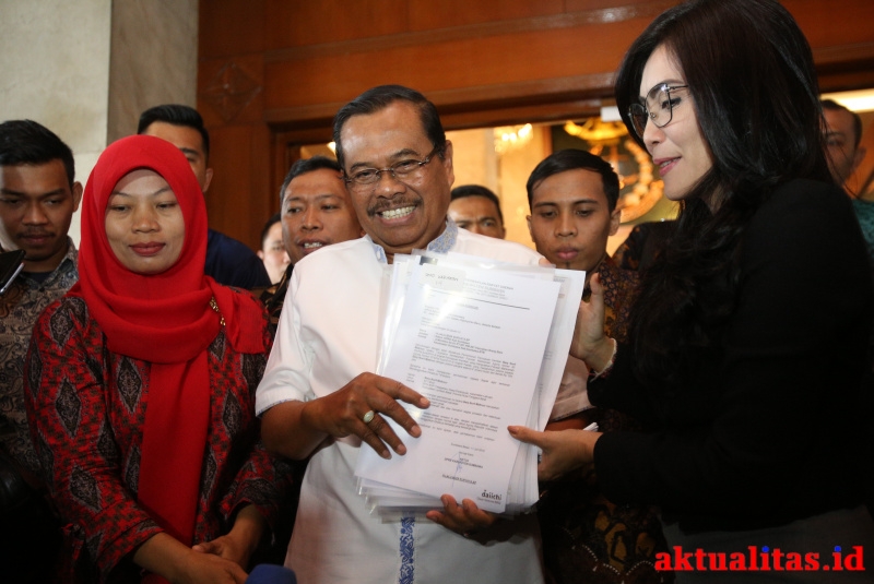 AKTUALITAS.ID – Jaksa Agung HM Prasetyo (tengah) menerima surat permohonan dari Anggota DPR Fraksi PDIP Rieke Diah Pitaloka (kanan) dan terpidana kasus pelanggaran Undang-Undang Informasi dan Transaksi Elektronik (UU ITE) Baiq Nuril Maknun (ketiga kiri) seusai melakukan pertemuan di kantor Kejaksaan Agung, Jakarta, Jumat (12/7/2019). Dalam pertemuan tersebut Rieke dan Baiq Nuril menyerahkan 132 surat permohonan dari sejumlah pihak untuk penangguhan eksekusi terhadap Baiq Nuril. [Kiki Budi Hartawan]