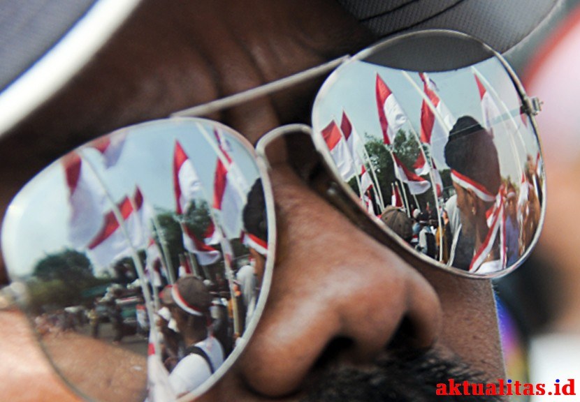 AKTUALITAS.ID – Aliansi Masyarakat Indonesia Timur menggelar aksi damai di depan Istana Negara, Senin (2/9/2019). Dalam aksi tersebut mereka mendukung terwujudnya perdamaian dan keamanan di Papua dengan tetap menjaga persatuan dan kesatuan Indonesia. AKTUALITAS.ID / Kiki Budi Hartawan.