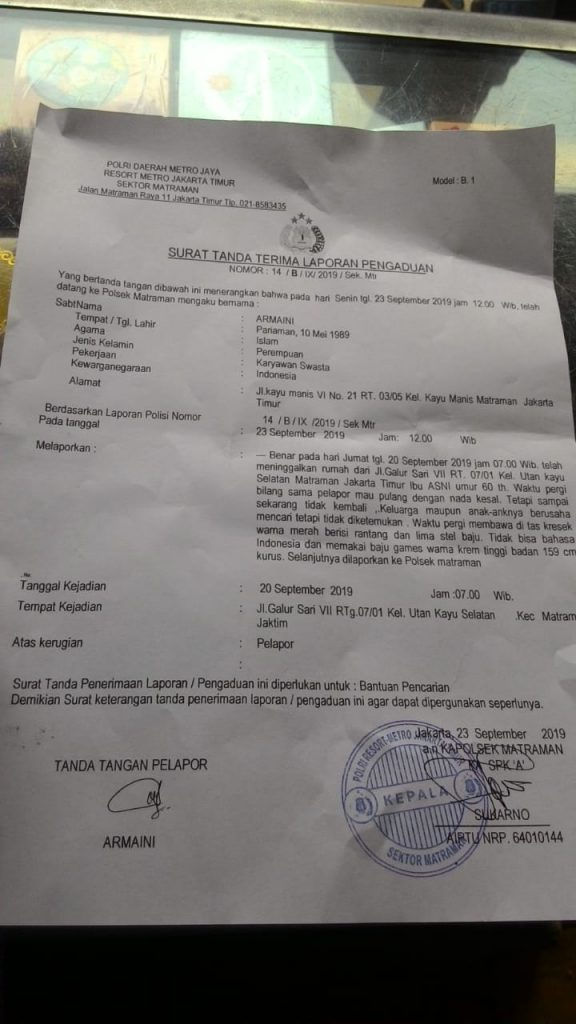 Armaini (30) istri Joni yang juga anak Asni, sudah melaporkan kehilangan ibunya ke Polsek Matraman, Jakarta Timur dengan nomor laporan 14/B/IX/2019/Sek.Mtr.