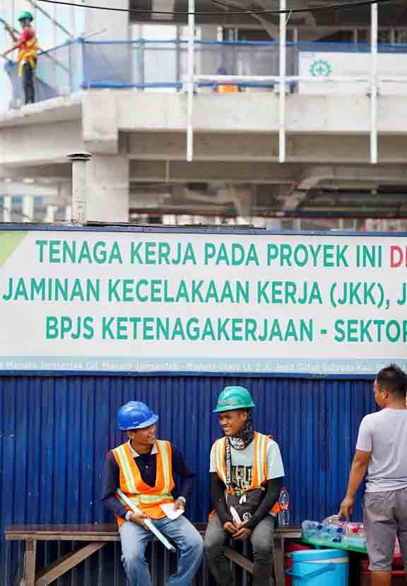 AKTUALITAS.ID – Pekerja konstruksi sedang bersantai menggunakan waktu istirahatnya di depan lokasi proyek di Jalan Kapten Tendean, Jakarta, Senin (18/11/2019). Waktu istirahat ini sangat dimanfaatkan para pekerja dengan sebaik baiknya agar tetap fokus dalam bekerja.[Kiki Budi Hartawan]