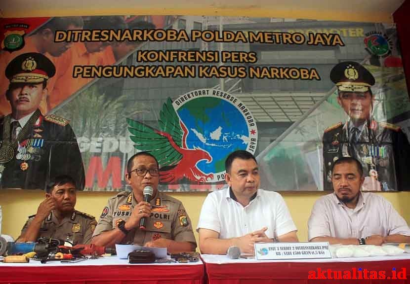 AKTUALITAS.ID – Kabid Humas Polda Metro Jaya Kombes Yusri Yunus (ketiga dari kiri) didampingi Kasubdit II Direktorat Narkoba Polda Metro Jaya AKBP Bagoes Wibisono (kiri), dan Kabagbinopsnal Dit Narkorba PMJ, AKBP Johanes Kindangen (kedua dari kanan) saat merilis dan menunjukkan barang bukti narkoba jenis Sabu di RS Polri, Kramat Jati, Jakarta Timur, Selasa (10/12/2019).