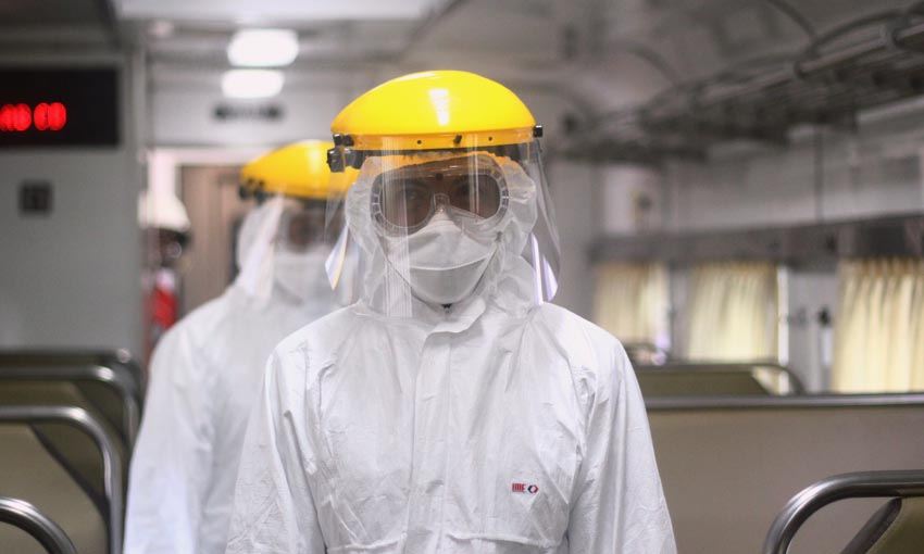 AKTUALITAS.IDPetugas melakukan sterilisasi, pest control treatment dan fumigasi pada gerbong kereta di Stasiun Pasar Senen, Jakarta, Minggu (15/3/2020). Selain melakukan sterilisasi, pest control treatment dan fumigasi, PT KAI DAOP 1, juga menyediakan cairan pembersih tangan serta fasilitas pemeriksaan kesehatan dan pengukuran suhu tubuh di setiap stasiun untuk mencegah penyebaran virus Corona (COVID-19). [Munzir]