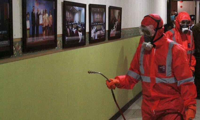 AKTUALITAS.ID – Sejumlah petugas melakukan penyemprotkan cairan desinfektan diruangan pimpinan Bawaslu RI, Jakarta, Kamis (19/3/2020).Kegiatan penyemprotan desinfektan itu untuk mencegah penularan COVID-19. [Munzir]