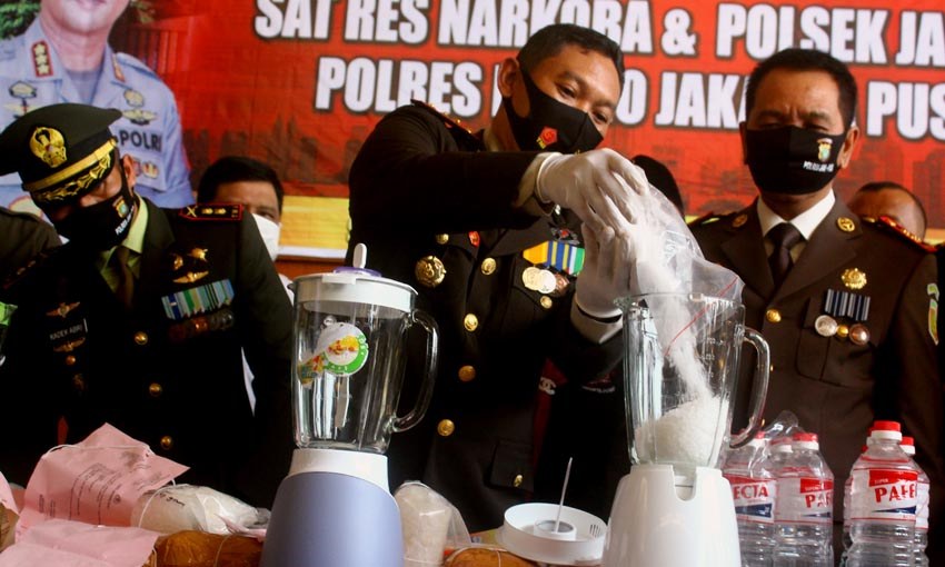 AKTUALITAS.ID – Kapolres Metro Jakarta Pusat, Kombes Pol Heru Novianto (tengah), saat pemusnahan narkoba di kantor Polres Metro Jakarta Pusat, Rabu (1/7/2020). Bertepatan dengan perayaan Hari Bhayangkara ke – 74, Kepolisian Resor Metro Jakarta Pusat memusnahkan barang bukti hasil pengungkapan kasus narkoba setahun terakhir berupa 29.000 butir pil ekstasi dan 8,5 kilogram sabu. [Munzir]