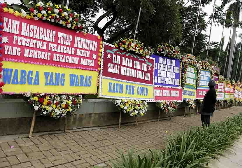 AKTUALITAS.ID – Puluhan karangan bunga memenuhi halaman Makodam Jaya di Jalan Mayjen Sutoyo, Jakarta Timur, Senin (23/11/2020). Karangan bunga tersebut bentuk dukungan terhadap Pangdam Jaya Mayjen Dudung Abdurahman, serta seluruh prajurit TNI dalam menyikapi aksi simpatisan Habib Rizieq Shihab yang terus berdatangan. Terlihat mulai Sabtu, (21/11/2020), karangan bunga dukungan membanjiri Markas Kodam Jaya, di Cililitan, Jakarta Timur. [Kiki Budi Hartawan]
