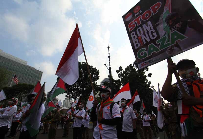 AKTUALITAS.ID – Massa Partai Keadilan Sejahtera (PKS) melakukan aksi bela Palestina di depan Kedutaan Besar Amerika Serikat, Jakarta, Kamis (20/05). Aksi tersebut dilakukan sebagai bentuk dukungan kepada bangsa Palestina untuk mendapatkan kemerdekaannya dari Israel. Aksi tersebut dihadiri Presiden PKS Ahmad Syaikhu, Sekjen PKS Aboe Bakar Al-Habsyi, Anggota DPR Kurniasih Mufidayati. [Kiki Budi Hartawan/Ari]