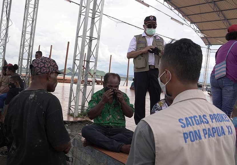 AKTUALITAS.ID – Kasubsatgas Prokes PON XX BNPB Kabupaten Jayapura Gatot Satria Wijaya bersama tim relawan membagikan masker kepada warga di Dermaga Kalkhote, Distrik Sentani Timur, Kabupaten Jayapura, Papua, Selasa (5/10/2021). Pembagian masker ini dilakukan untuk meningkatkan ketaatan Prokes masyarakat serta untuk mencegah penyebaran Covid-19. [Kiki Budi Hartawan]