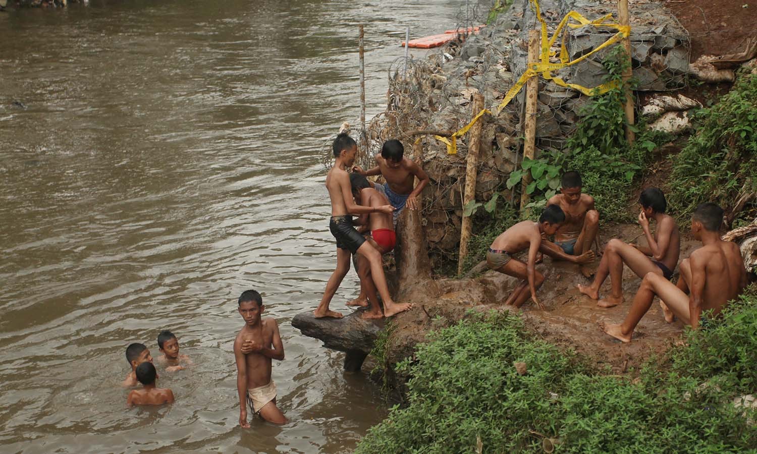 Minimnya fasilitas membuat anak anak berenang di Kanal Banjir Barat