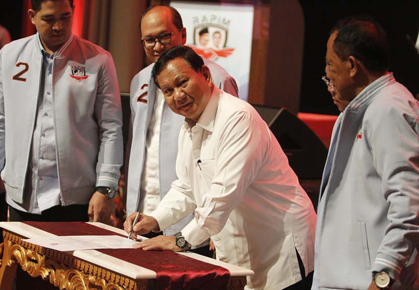 AKTUALITAS.ID – Calon presiden nomor urut 2 Prabowo Subianto menghadiri deklarasi Rapim didampingi Ketua Tim Kampanye Nasional (TKN) Prabowo Subianto-Gibran Rakabuming Raka, Rosan Perkasa Roeslani (kiri) dan Ketua Relawan Pedagang Indonesia Maju (RAPIM) Anton Timbang menghadiri acara deklarasi di Djakarta Theater, Jakarta Pusat, Jumat (8/12/2023). Relawan Pedagang Indonesia Maju (RAPIM) adalah kelompok relawan yang memperjuangkan aspirasi dan harapan pedagang Indonesia tersebut mendeklarasikan dukungan untuk memenangkan pasangan calon presiden dan wakil presiden nomor urut 2 Prabowo Subianto-Gibran Rakabuming Raka dalam satu putaran Pilpres 2024.[Kiki Budi Hartawan]