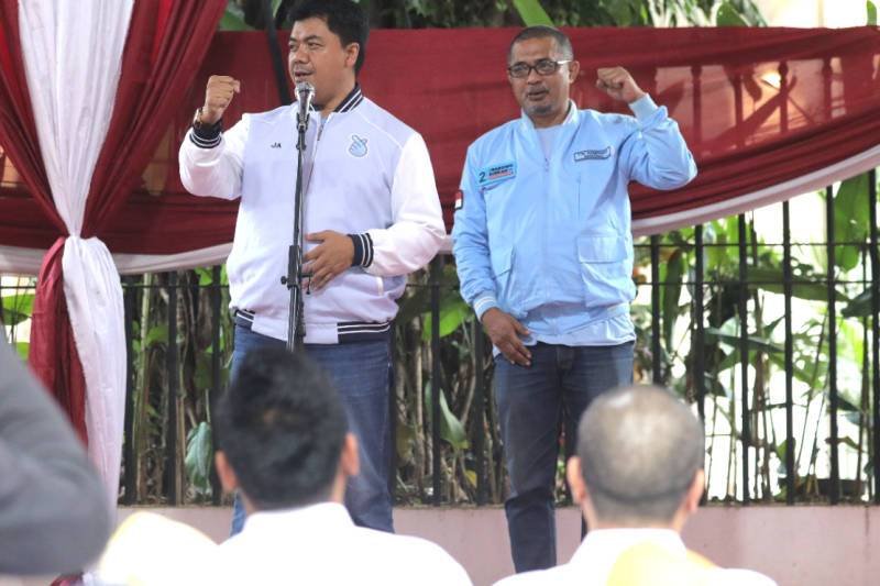 AKTUALITAS.ID – Wakil Ketua Tim Kampanye Nasional (TKN) Prabowo-Gibran, Juri Ardiantoro, Ketua Umum PIR Aries Sunan dan Dewan Pengawas PIR Yasbun dalam acara deklarasi di kawasan Kertanegara, Jakarta, Minggu (14/1/2024). Kalangan penjahit rumahan dan pelaku usaha kecil yang tergabung dalam Penjahit Indonesia Raya (PIR) mendeklarasikan dukungan kepada calon presiden dan calon wakil presiden nomor urut 2 Prabowo Subianto dan Gibran Rakabuming Raka. [Kiki Budi Hartawan]