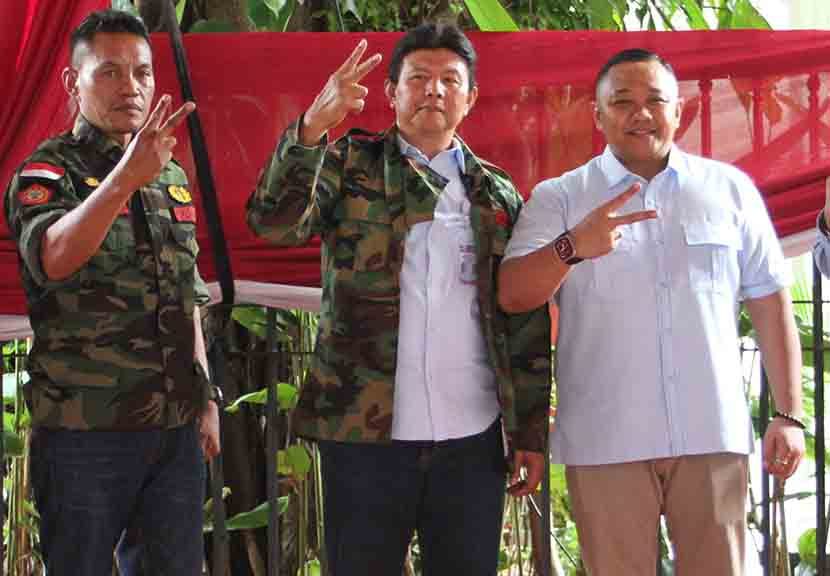 AKTUALITAS.ID – Ketua Relawan Persatuan Relawan Perlindungan masyarakat (Perlinmas) Dede Misbakhudin saat mengenakan baju kepada Wakil Ketua Tim Kampanye Nasional (TKN) Komjen (Purn) Ari Dono Sukmanto di kediman Prabowo Subianto, Jakarta Selatan, Senin (15/1/2024). Perlinmas secara resmi mendeklarasikan dukungan kepada capres dan cawapres nomor urut 2, Prabowo Subianto dan Gibran Rakabuming Raka di Pilpres 2024 karena pasangan Prabowo-Gibran mempunyai visi dan misi yang sama dengan Perlinmas. [Kiki Budi Hartawan]