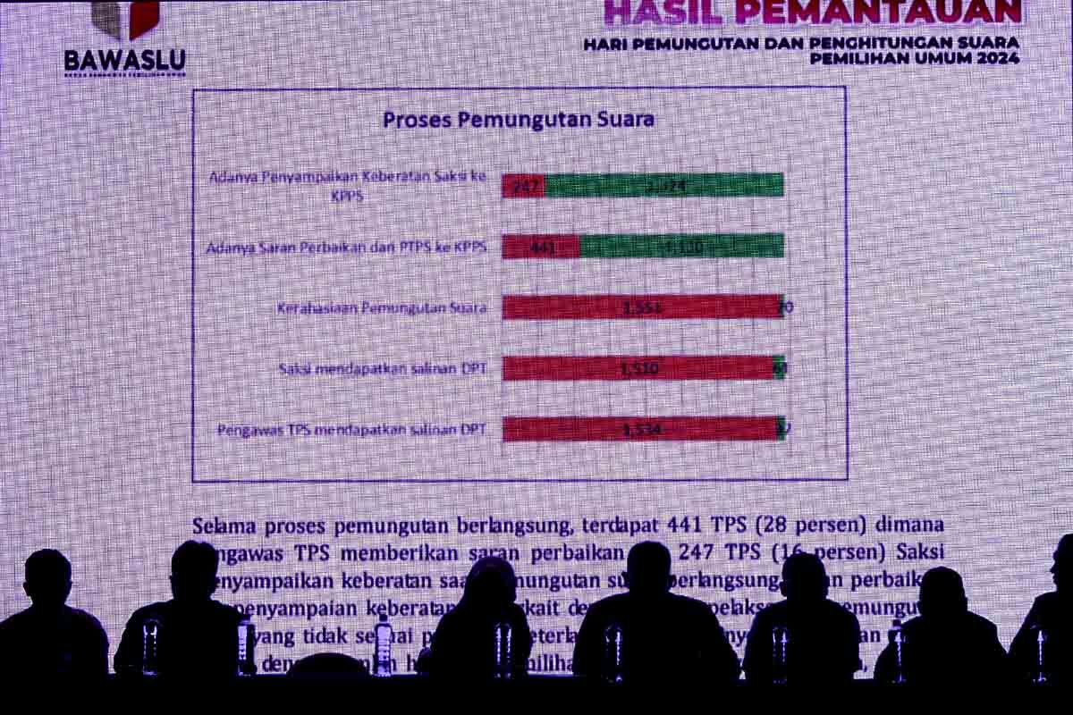 AKTUALITAS.ID – Badan Pengawas Pemilu (Bawaslu) menggelar konferensi pers dan publikasi hasil pengawasan pemungutan dan penghitungan surat suara pemilu 2024 di Hotel Aryaduta, Jakarta, Kamis (15/2/2024). Pemantau pemilu yang bergerak di bawah naungan Bawaslu menemukan sejumlah kendala pemungutan suara, salah satunya terkait logistik.