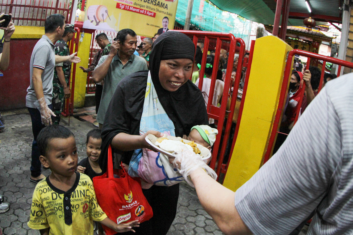 AKTUALITAS.ID – Warga menerima takjil (makanan berbuka puasa) yang dibagikan langsung oleh jemaat Vihara Dharma Bakti di Petak Sembilan, Glodok, Jakarta Barat, Senin (18/3/2024). Pengurus vihara berbagi 300 porsi untuk berbuka puasa. Hal tersebut rutin dilakukan pihak vihara guna mempererat persaudaraan dan menumbuhkan toleransi antar umat beragama selama bulan Ramadan. [Zaigham Priatna]