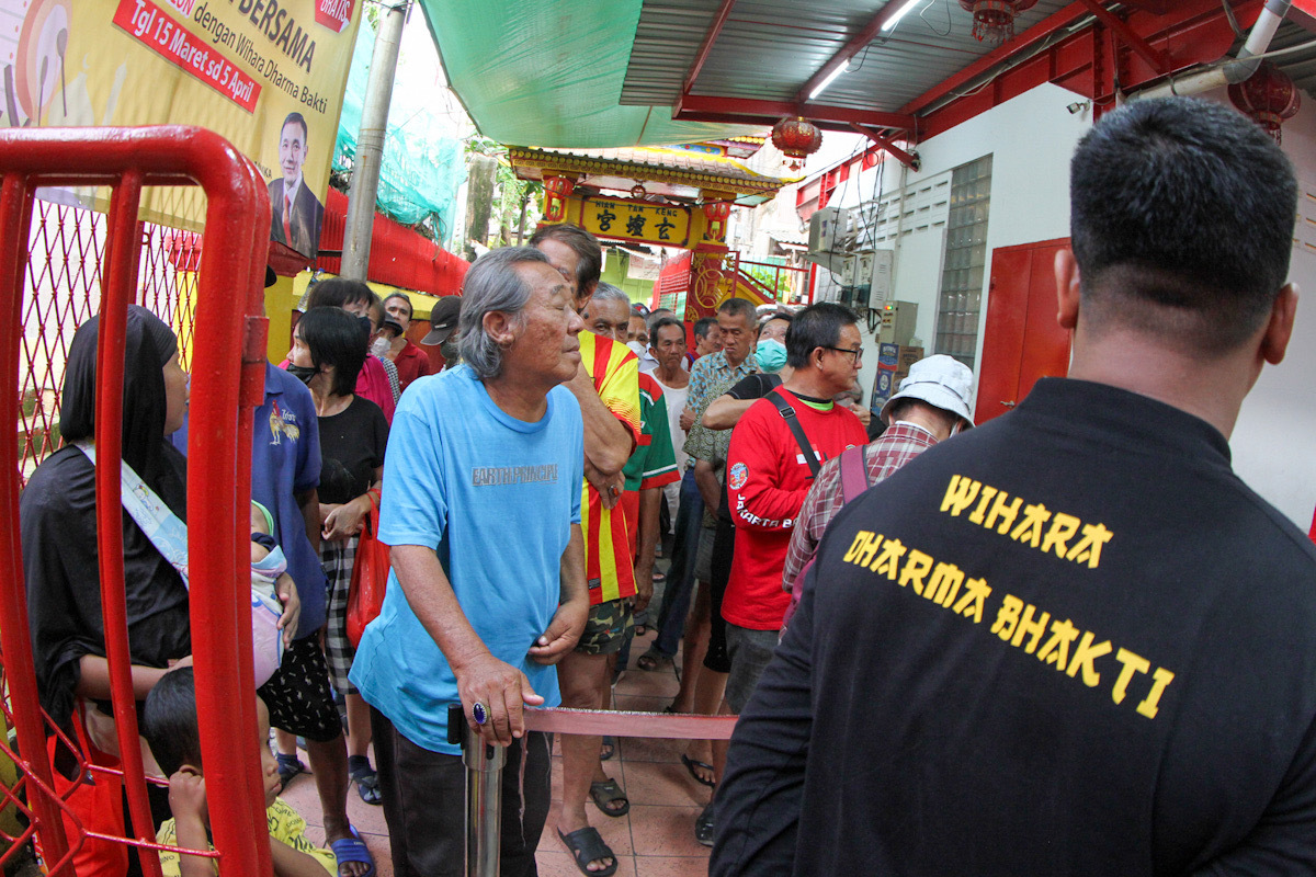 AKTUALITAS.ID – Warga menerima takjil (makanan berbuka puasa) yang dibagikan langsung oleh jemaat Vihara Dharma Bakti di Petak Sembilan, Glodok, Jakarta Barat, Senin (18/3/2024). Pengurus vihara berbagi 300 porsi untuk berbuka puasa. Hal tersebut rutin dilakukan pihak vihara guna mempererat persaudaraan dan menumbuhkan toleransi antar umat beragama selama bulan Ramadan. [Zaigham Priatna]