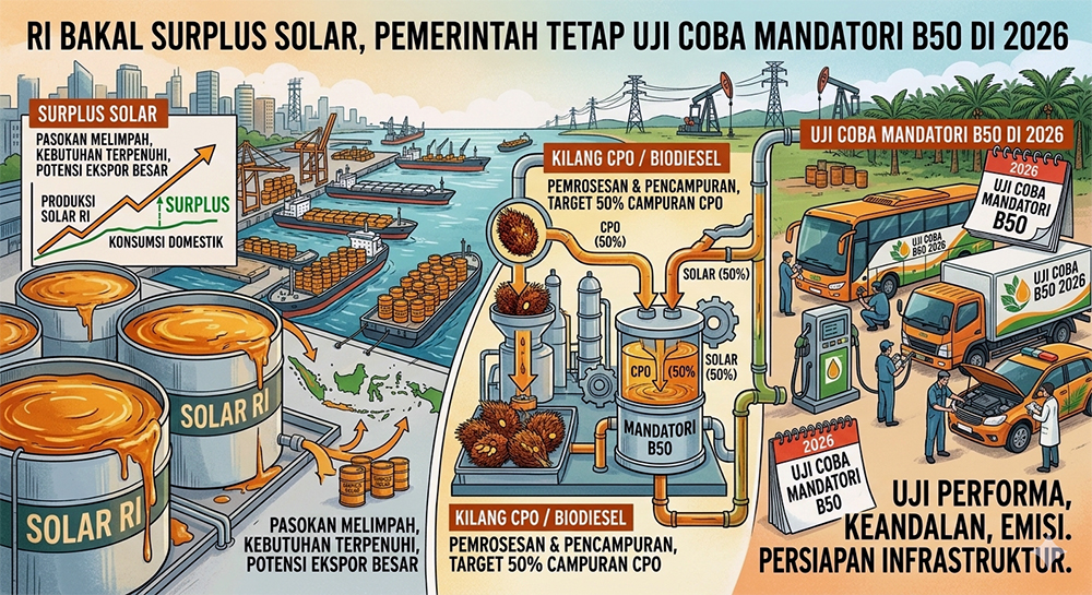 Meski proyeksi surplus menguat, pemerintah tetap menargetkan implementasi B50 pada semester II 2026. Uji coba atau road test telah dilakukan pada mobil penumpang, truk, hingga alat berat guna memastikan kesiapan teknis.