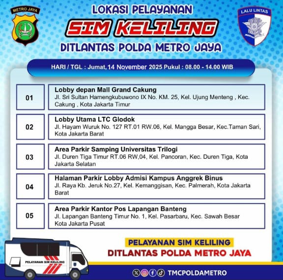 Melalui akun X resmi @tmcppoldametro, diinformasikan bahwa layanan tersebut pada Jumat (14/11/2025) buka mulai pukul 08.00 sampai 14.00 WIB.