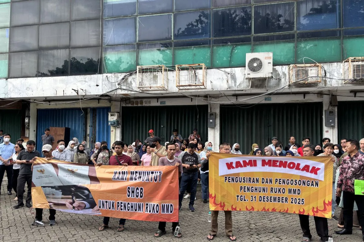 Spanduk itu dibentangkan sejumlah warga di depan kantor pengelola Ruko MMD. Warga mendesak agar pihak pengelola memberikan penjelasan setelah adanya intimidasi surat edaran pengosongan ruko pada Rabu 31 Desember 2025.