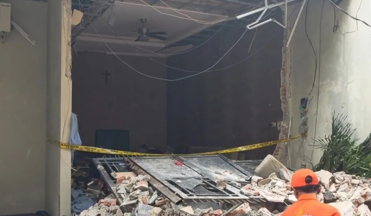 Di lokasi, bagian depan dan dalam rumah rusak berat. Puing-puing bangunan berserakan hingga ke jalan.