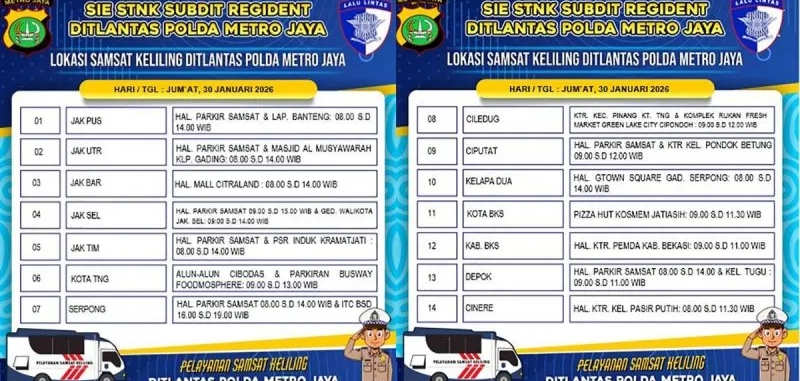 Dikutip dari Akun X resmi TMC Polda Metro Jaya @tmcpoldametro, berikut lokasi gerai Samsat Keliling di Jadetabek pada Jumat (30/1/2026):