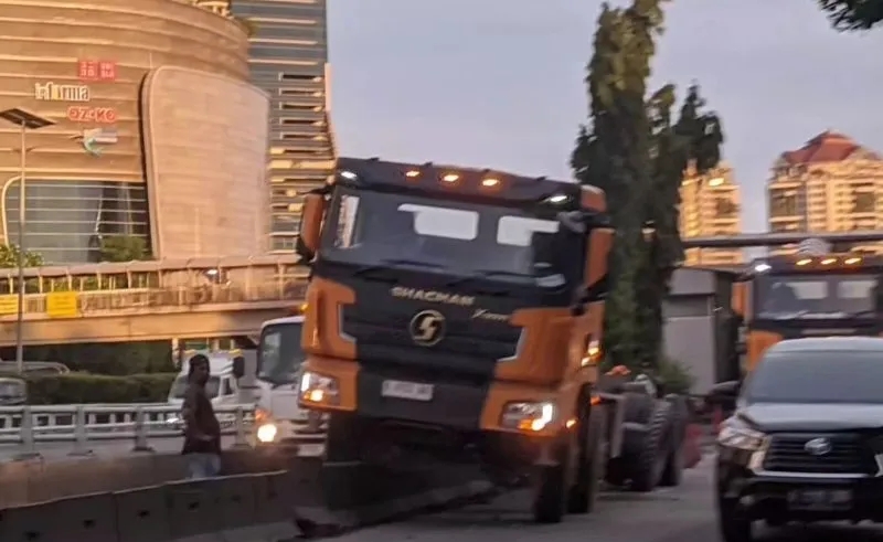 AKTUALITAS.ID – Dalam video yang viral di media sosial, sebuah truk berwarna oranye tanpa kontainer menabrak separator busway hingga ban kanan depannya terangkat ke atas beton separator dan badan truk miring ke kanan.