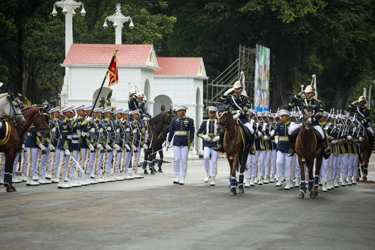 Kemudian, pasukan berkuda dari Batalyon Kavaleri Paspampres masuk perlahan ke tengah jalanan di depan Istana Merdeka, diikuti sejumlah prajurit berseragam khusus lengkap dengan senapannya.