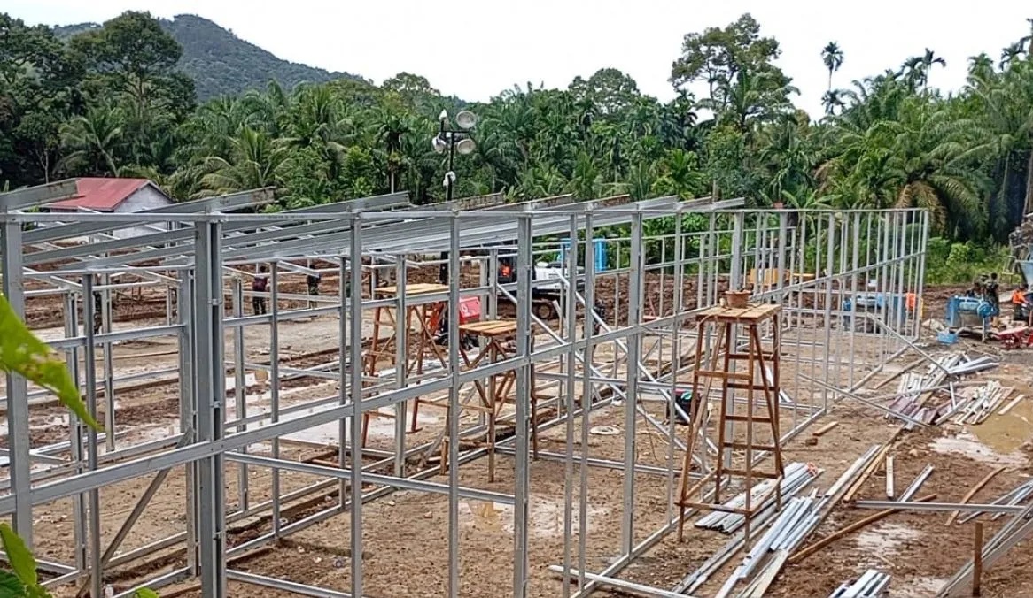 Hingga kini, proses pengerjaan huntara di Lapangan SD Negeri 05 Kayu Pasak telah mencapai 50 persen dari target.