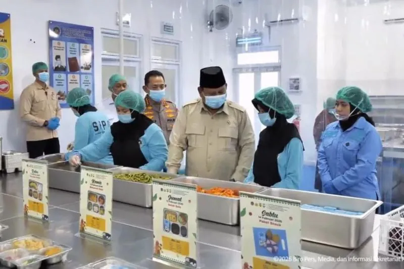 Presiden Prabowo Subianto meninjau Satuan Pelayanan Pemenuhan Gizi (SPPG) Polri, dan menekankan agar menu Makan Bergizi Gratis (MBG) disajikan dalam kondisi hangat.