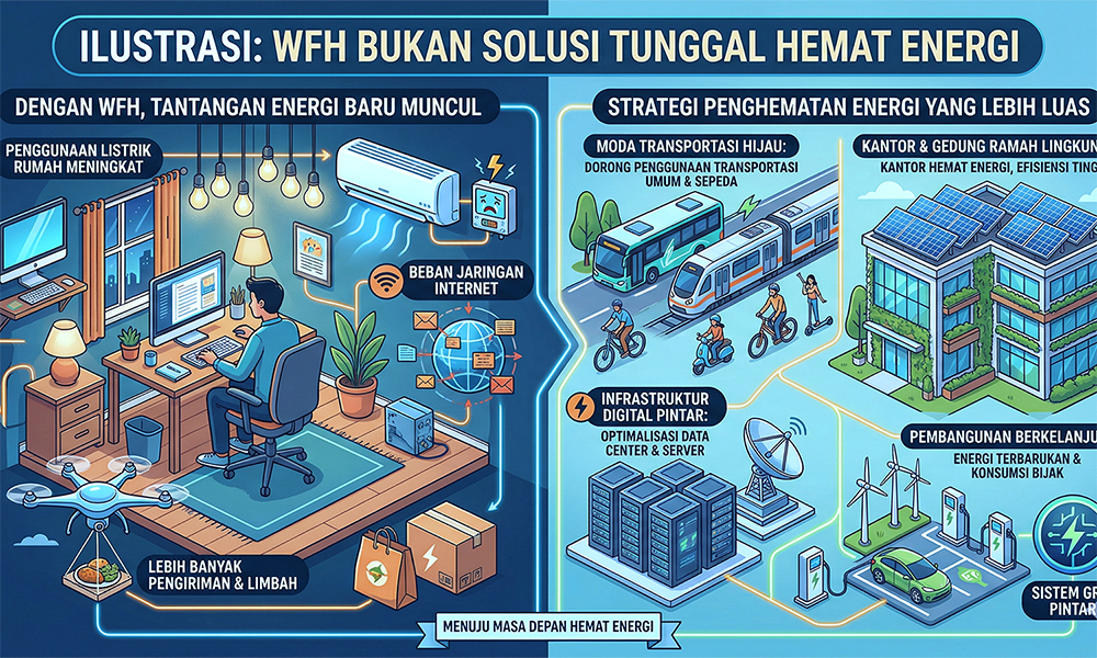 Ia juga mengingatkan bahwa penerapan WFH memiliki konsekuensi sosial dan ekonomi yang perlu dipertimbangkan, mulai dari produktivitas kerja, kualitas layanan publik, hingga potensi meningkatnya beban listrik rumah tangga.