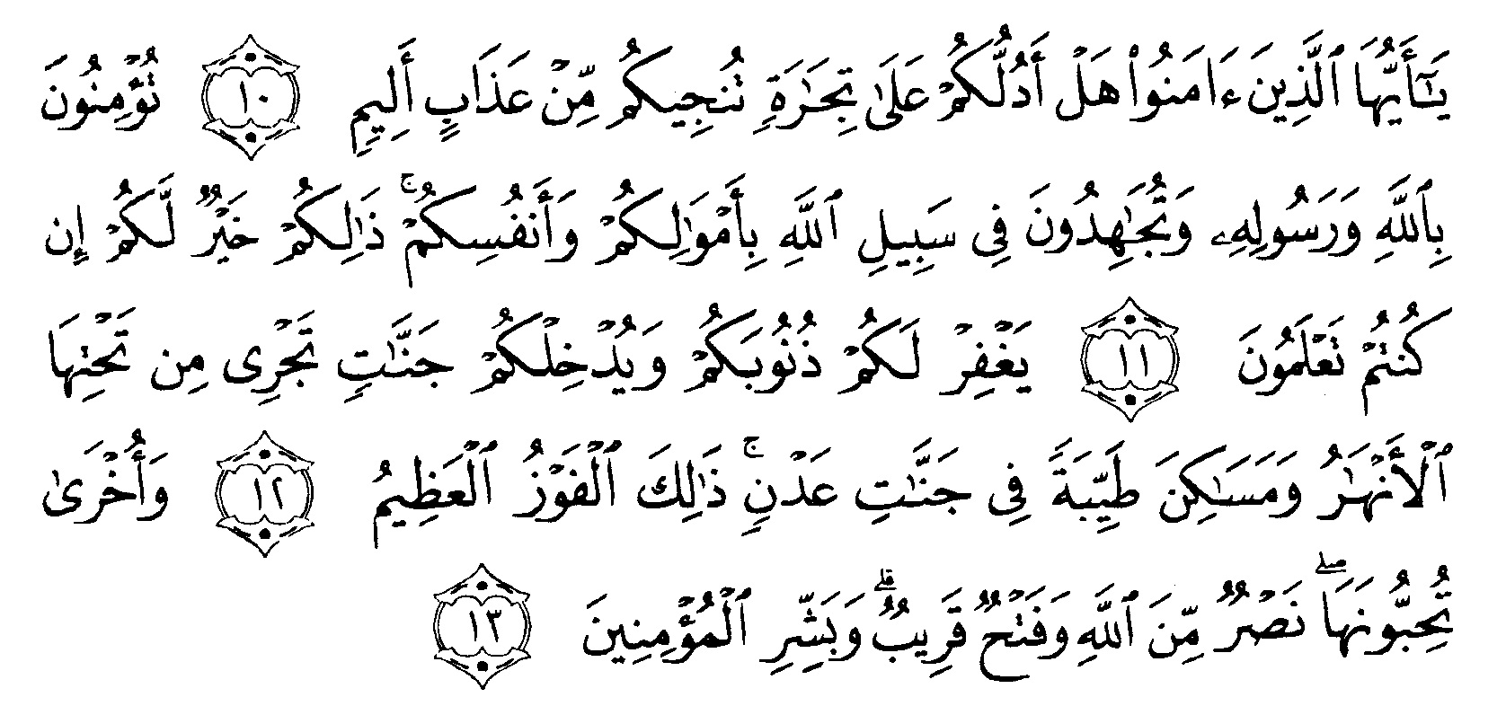 Tawaran “Perdagangan” dari Allah Pada ayat 10-11, Allah menawarkan sebuah perniagaan (tijarah) yang dapat menyelamatkan manusia dari azab pedih. Perniagaan tersebut adalah beriman kepada Allah dan Rasul-Nya, serta berjihad dengan harta dan jiwa. Balasannya adalah ampunan dosa dan surga ‘Adn yang mengalir sungai-sungai di bawahnya.