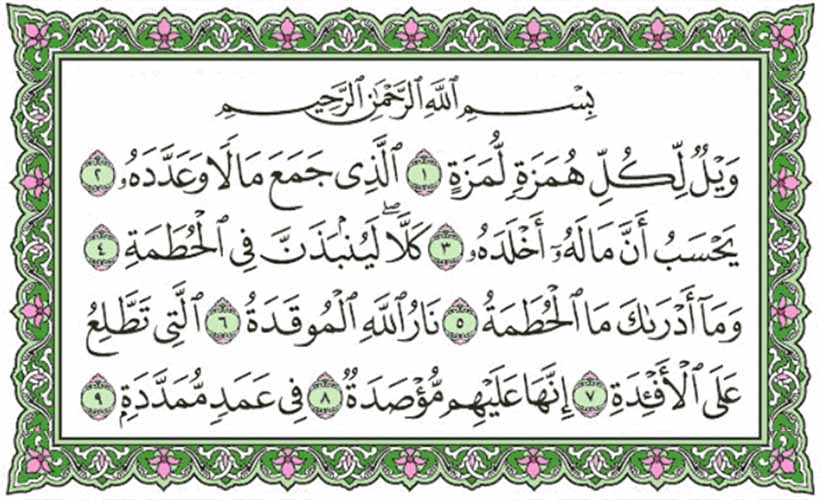Wailul likulli humazatil lumazah. Alladzii jama’a maalaaw wa’addadah. Yahsabu anna maalahuu akhladah. Kallaa layumbadzanna fil huthomah. Wamaa adrooka mal huthomah. Naarulloohil muuqodah. Allatii taththoli’u ‘alal af’idah. Innahaa ‘alaihim mu’shodah. Fii ‘amadim mumaddadah.