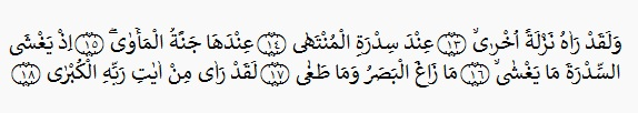 Wa laqad ra ahu nazlatan ukhra, inda sidratil muntaha, indaha jannatul-ma wa, iz yagsyas-sidrata ma yagsya, ma zagal-basaru wa mat taga, laqad ra a min ayati rabbihil-kubra.