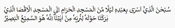 Artinya: “Maha Suci Allah, yang telah memperjalankan hamba-Nya pada suatu malam dari Al Masjidil Haram ke Al Masjidil Aqsha yang telah Kami berkahi sekelilingnya agar Kami perlihatkan ke arahnya sebagian dari tanda-tanda (kebesaran) Kami. Sesungguhnya Dia adalah Maha Mendengar lagi Maha Mengetahui.”