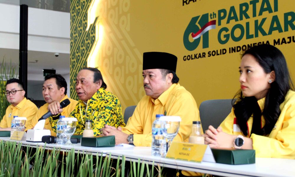 AKTUALITAS.ID – Ketua Penyelenggara HUT Ke-61 Partai Golkar, Muhidin M Said (ketiga kiri)bersama jajaran pengurus panitia Idris Laena (kedua kanan), Putri Komarudin (kedua kanan), Said Aldi...