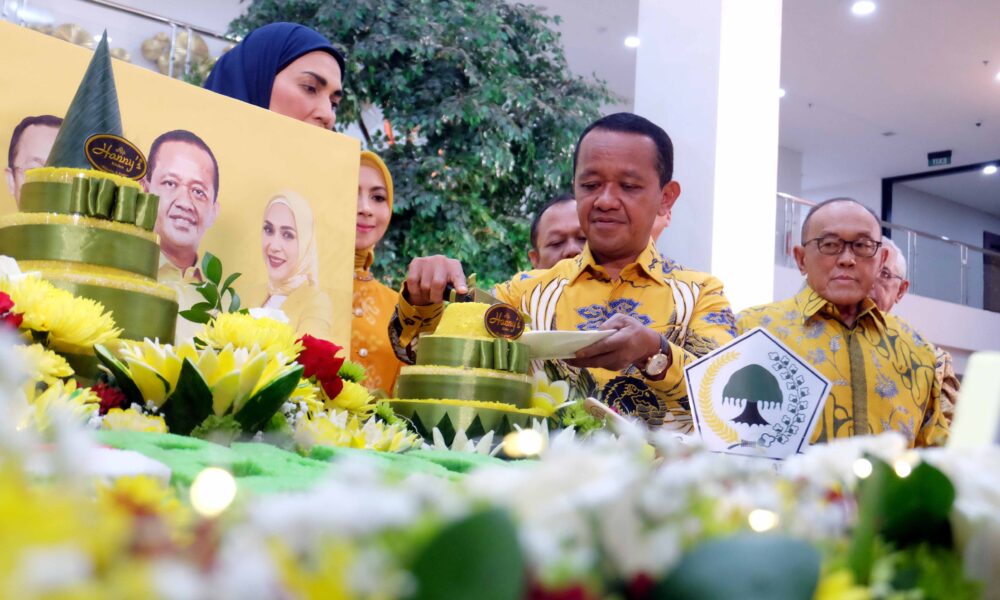 AKTUALITAS.ID – Ketua Umum Partai Golkar Bahlil Lahadalia (tengah) didampingi sejumlah pimpinan lainnya memotong tumpeng dalam acara Tasyakuran Hari Ulang Tahun (HUT) ke-61 Partai Golkar di...