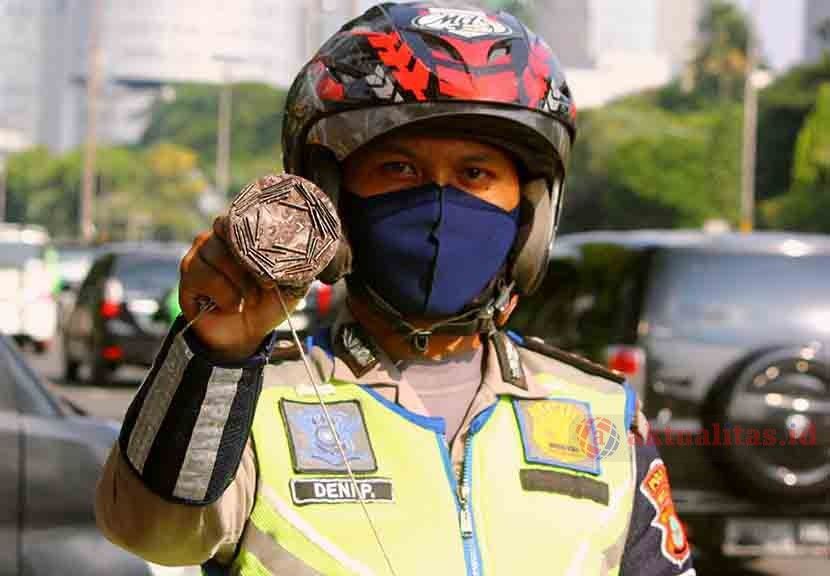 AKTUALITAS.ID – Seorang anggota Polantas Gatur Polda Metro Jaya Brigadir Deni P memungut paku yang tersebar menggunakan besi berani di Jalan Gatot Subroto, Jakarta Selatan, Jumat...