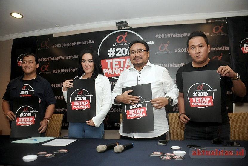 - Politikus PDIP Rieke Diah Pitaloka, Ketua Umum GP Anshor Yaqult Cholil Quomas bersam dengan Tim Nasional Alpha Relawan Jokowi saat peluncuran tagar 2019TetapJokowi di Cikini, Jakarta Pusat, Kamis (13/9/2018).Tim Alpha siap mendukung Jokowi-Ma’ruf Amin di Pilpres 2019. Relawan Jokowi-Ma’ruf Amin itu dipimpin oleh politikus PDIP Rieke Diah Pitaloka. (Foto: Kiki Budi Hartawan)