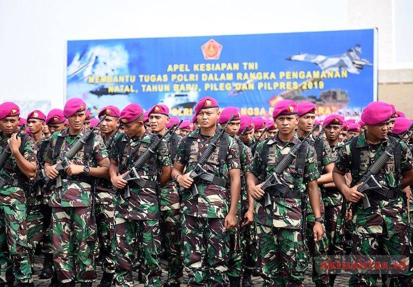 - Pasukan Gabungan TNI-Polri saat mengikuti Apel Kesiapan Natal, Tahun Baru 2019 serta menjelang Pemilu legislasi dan Presiden 2019 di lapangan silang Monas, Jakarta, Jumat (30/11/2018). Apel kesiapan ini diikuti 50.000 personel dari Angkatan Darat, Angkatan Laut, Angkatan Udara, dan Polri.
