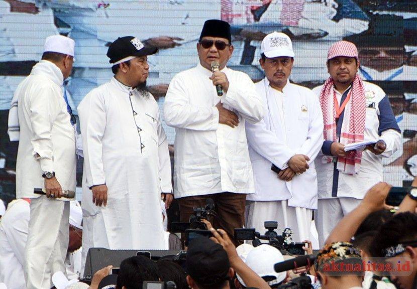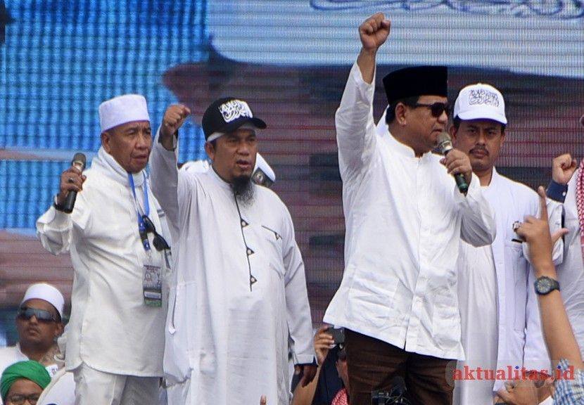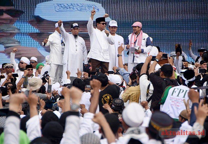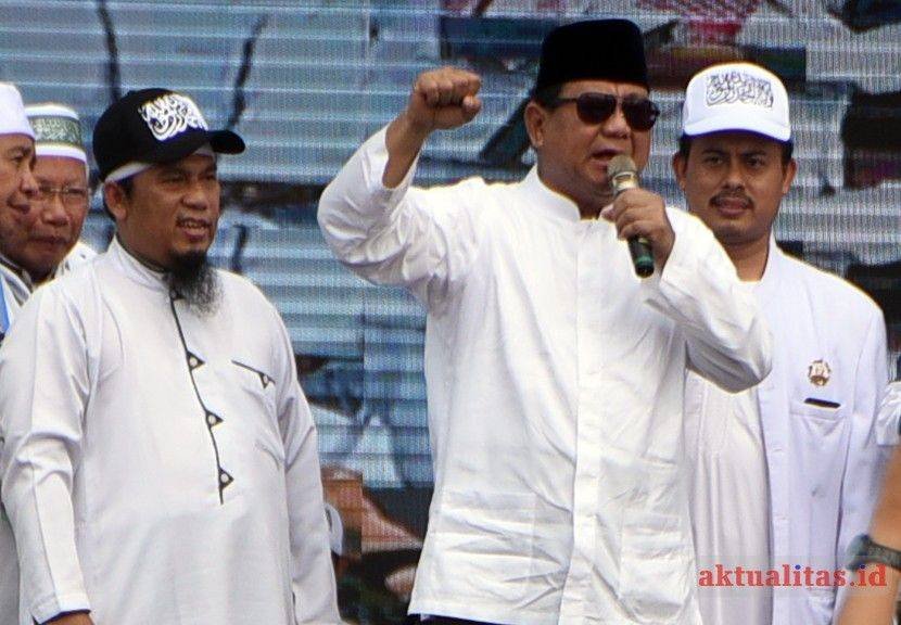 - Calon Presiden No urut 2 Prabowo Subianto usai menyampaikan pidato di hadapan jutaan umat muslim dalam acara Reuni Akbar Mujahid 212 di Lapangan Monumen Nasional (Monas), Jakarta, Minggu (2/12). Dalam kesempatan acara Reuni Akbar Mujahid 212 yang diadakan ketiga kalinya ini mengangkat tema ‘Dengan Tauhid Kita Menuju Kejayaan NKRI’./aktualitas.id/kbh