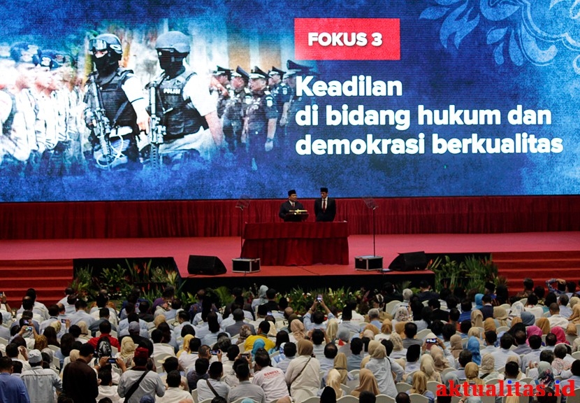 AKTUALITAS.ID – Calon Presiden nomor urut 02 Prabowo Subianto (kiri) didampingi calon Wakil Presiden Sandiaga Uno (kanan) menyampaikan pidato kebangsaan di Jakarta Convention Center, Jakarta, Senin (14/1/2019). Prabowo-Sandiaga menyampaikan pidato kebangsaan dengan tema “Indonesia Menang” yang merupakan tagline visi dan misinya [KBH]