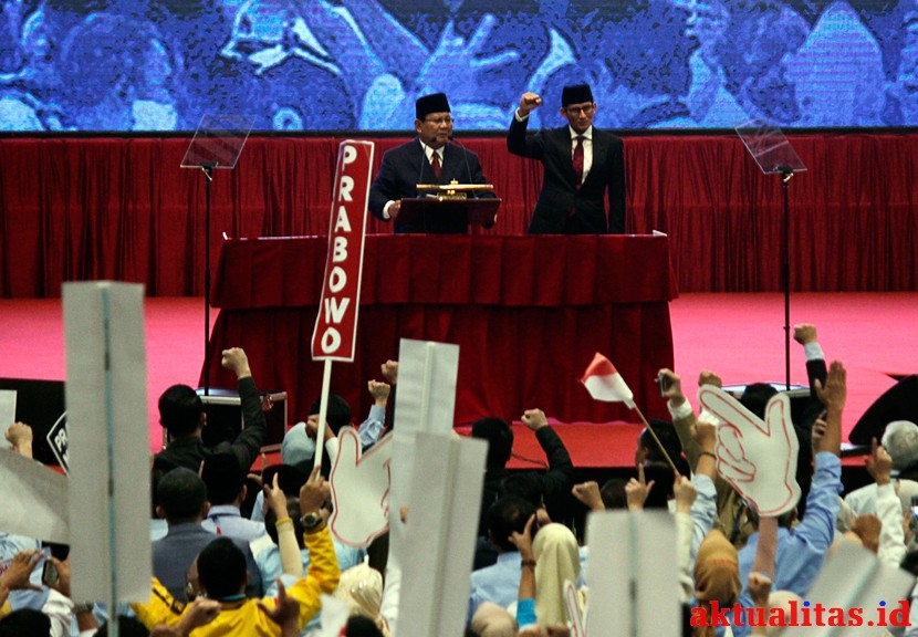 AKTUALITAS.ID – Calon Presiden nomor urut 02 Prabowo Subianto (kiri) didampingi calon Wakil Presiden Sandiaga Uno (kanan) menyampaikan pidato kebangsaan di Jakarta Convention Center, Jakarta, Senin (14/1/2019). Prabowo-Sandiaga menyampaikan pidato kebangsaan dengan tema “Indonesia Menang” yang merupakan tagline visi dan misinya [KBH]