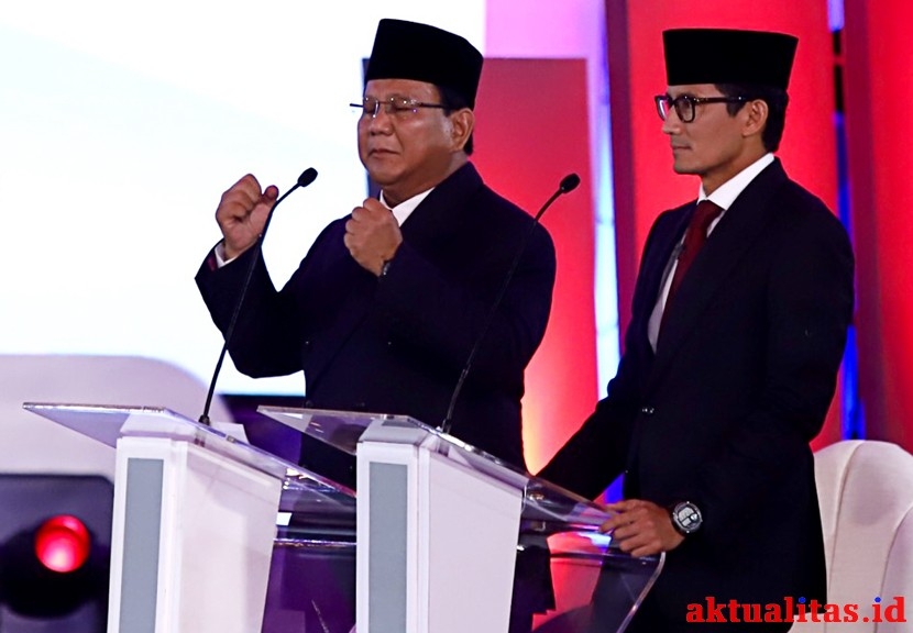 AKTUALITAS.ID – Pasangan capres-cawapres nomor urut 01 Joko Widodo (ketiga kiri) dan Ma’ruf Amin (kiri) bersalaman dengan pasangan nomor urut 02 Prabowo Subianto (kedua kanan) dan Sandiaga Uno (kanan) usai Debat Pertama Capres & Cawapres 2019, di Hotel Bidakara, Jakarta, Kamis (17/1/2019). Debat tersebut mengangkat tema Hukum, HAM, Korupsi, dan Terorisme. [KBH]