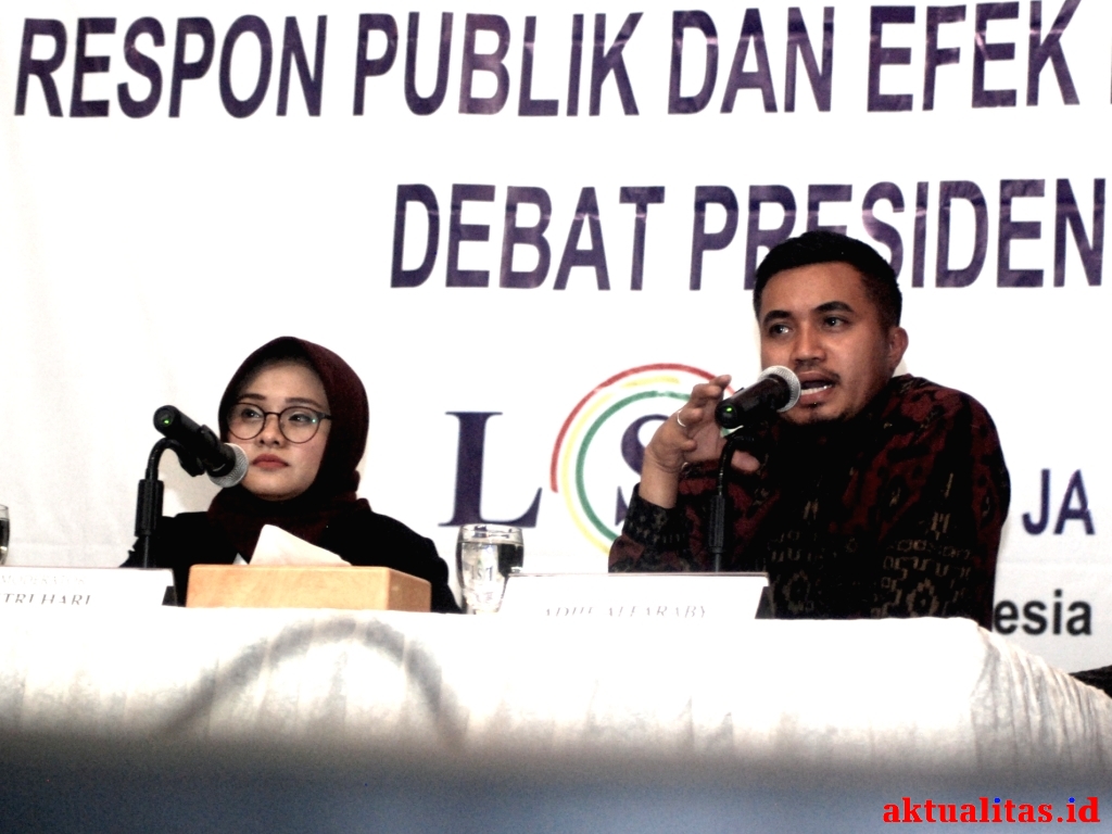 AKTUALITAS.ID – Peneliti senior LSI Denny JA, Adji Alfaraby (kanan) didampingi moderator Fitri Hari memaparkan hasil temuan terbaru survei nasional dengan tema “Respon Publik dan Efek Elektoral Debat Presiden 1” di kantor Lingkaran Survei Indonesia (LSI), Rawamangun, Jakarta, Rabu (30/1/2019). Melalui peneliti seniornya, Adji Alfarabi, survei LSI Denny JA pasca debat pertama menunjukkan bahwa tak ada perubahan signifikan dari elektabilitas kedua pasangan calon. Dimana pasangan Jokowi-Ma,ruf elektabilitasnya berada di 54,8 persen, unggul atas Prabowo-Sandi diangka 31 persen. [KBH]