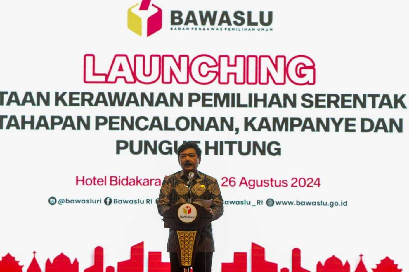 AKTUALITAS.ID – Menko Polhukam Hadi Tjahjanto, bersama Ketua Bawaslu Rahmat Bagja dan Ketua KPU Mochammad Afifuddin, memukul kentongan saat meluncurkan Pemetaan Kerawanan Pemilihan Serentak 2024 di Jakarta, Senin (26/8/2024).