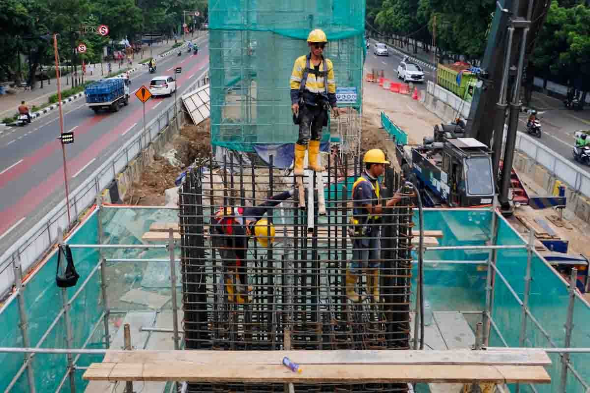 AKTUALITAS.ID – Pekerja melakukan pengecoran tiang pancang LRT Velodrome-Manggarai di kawasan Rawamangun, Jakarta Timur, Senin (28/10/2024).