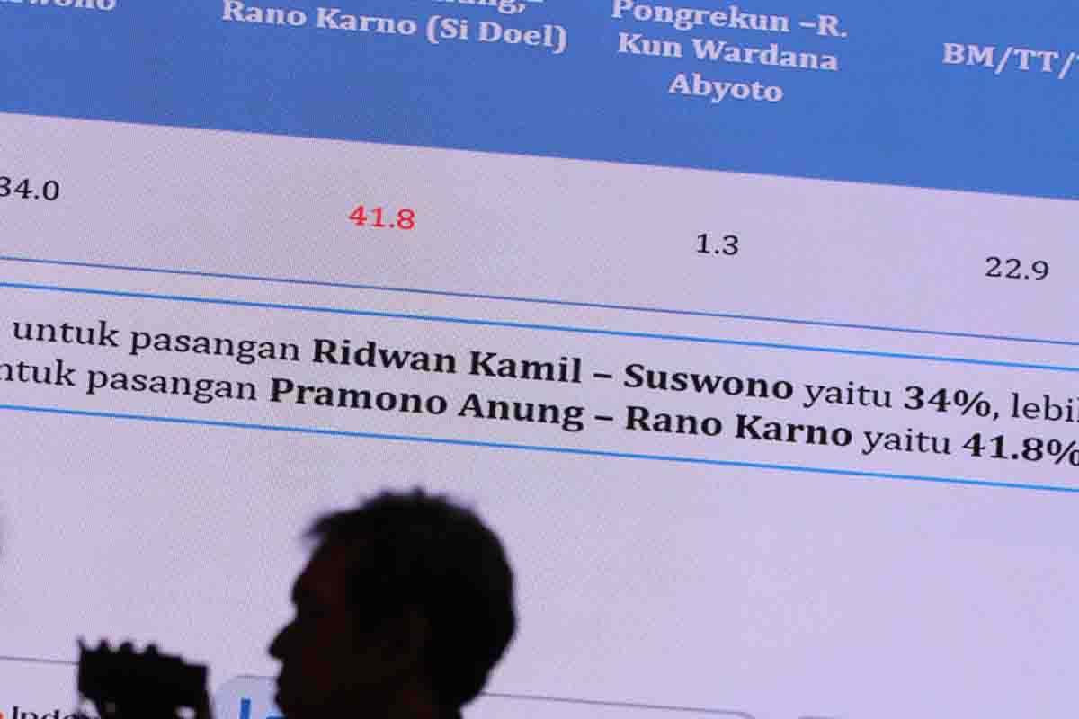 Sementara di Pilgub Jakarta, pasangan yang didukung KIM, Ridwan Kamil-Suswono meraih elektabilitas 37,4 persen, bersaing ketat dengan Pramono-Rano (37,1 persen), sedangkan Dharma Pongrekun-Kun Wardana, elektabilitasnya hanya 4,0 persen. (Agus Priatna)