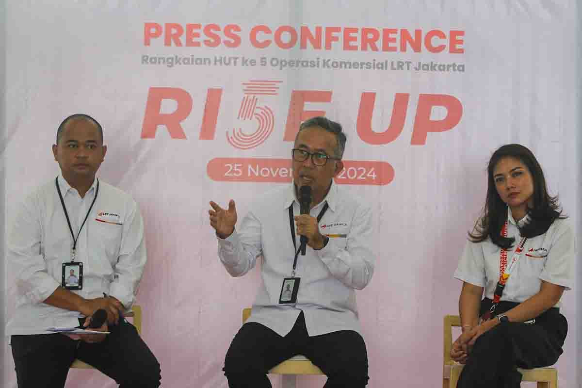 AKTUALITAS.ID – Direktur Utama PT LRT Jakarta Hendri Saputra (tengah), Board of Director (BOD) Senior Advisor LRT Jakarta Sheila Indira (dua kanan), Kepala Divisi Sekertaris LRT Jakarta Aris Rizal Arafah, foto bersama usai menggelar konferensi pers persiapan gelar Fun Run RI5E Up dalam rangka memperingati HUT ke-5 Perjalanan Operasi Komersial LRT Jakarta di Stasiun Velodrome LRT Jakarta, Rawangun, Jakarta, Senin (25/11/2024).